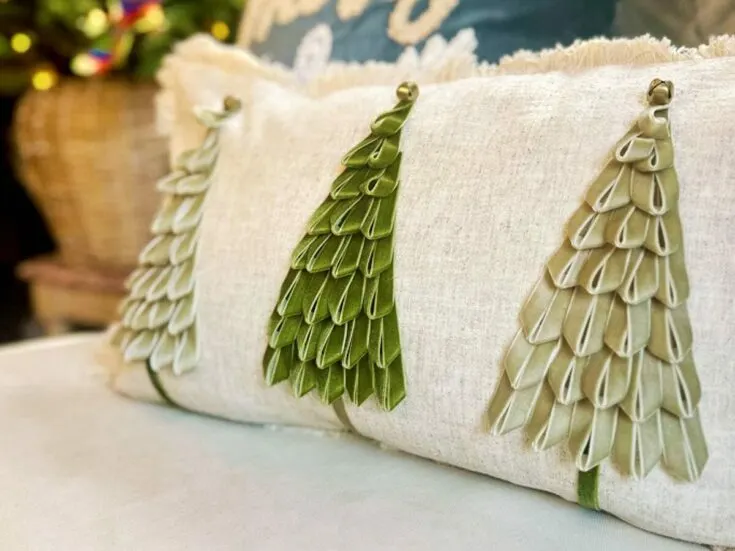A clever 30-minute no-sew velvet tree pillow tutorial that turns velvet ribbons into Christmas tree silhouettes on throw pillows. It’s a stylish, simple way to bring texture and festive flair to your home décor this season.