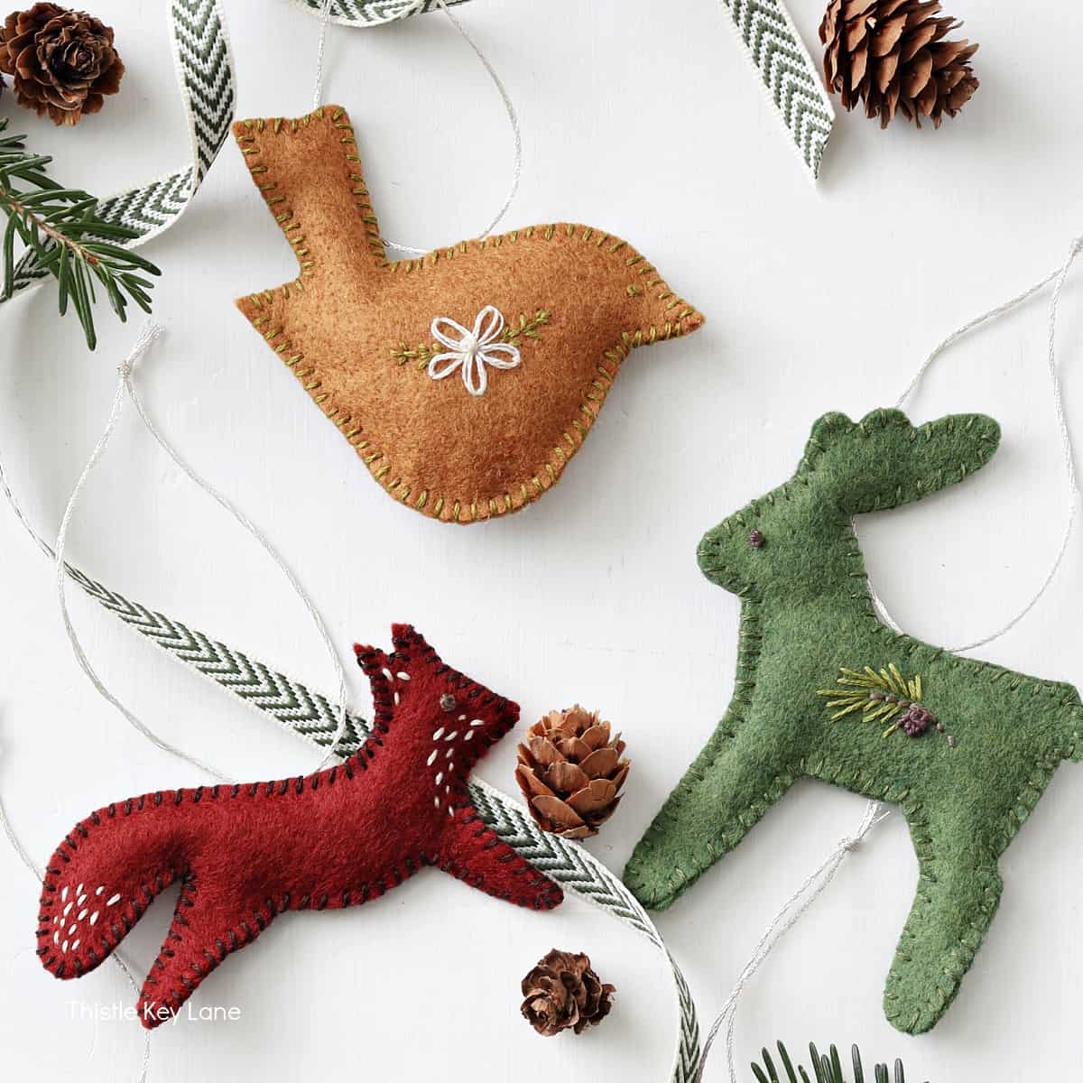 These felt woodland animal Christmas ornaments are delightfully simple and charming. With just felt, embroidery thread, and minimal stitching, these cute bear, deer, and owl shapes make perfect additions to any Scandinavian-style tree or as handmade gift toppers.