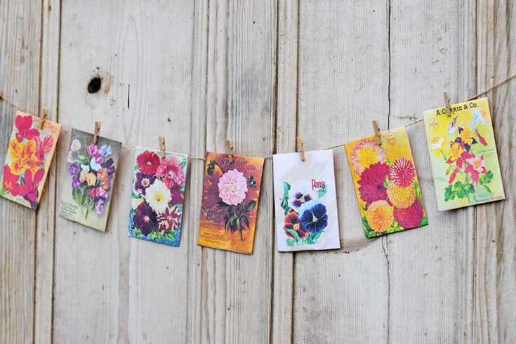 These gorgeous vintage seed packet templates feature botanical illustrations from the “Golden Age” of seed catalogue art (1880s–1900s) turned into downloadable envelope-style packets. Print, cut, fold, and glue to create charming keepsakes, or decoupage them onto tin can planters for a whimsical, rustic-craft vibe.